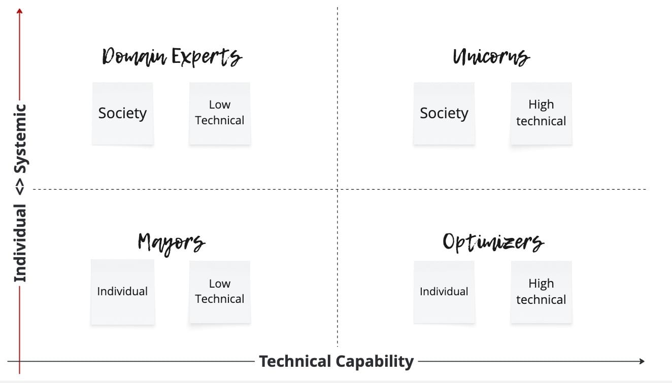 The vertical axis is focus: individual or systemic. The horizontal is technical capability — specifically, the ability to build software products from scratch that leverage data and AI to create efficiencies. Not domain expertise. Not research chops. The Mark Cuban type, not the Jamie Dimon type.